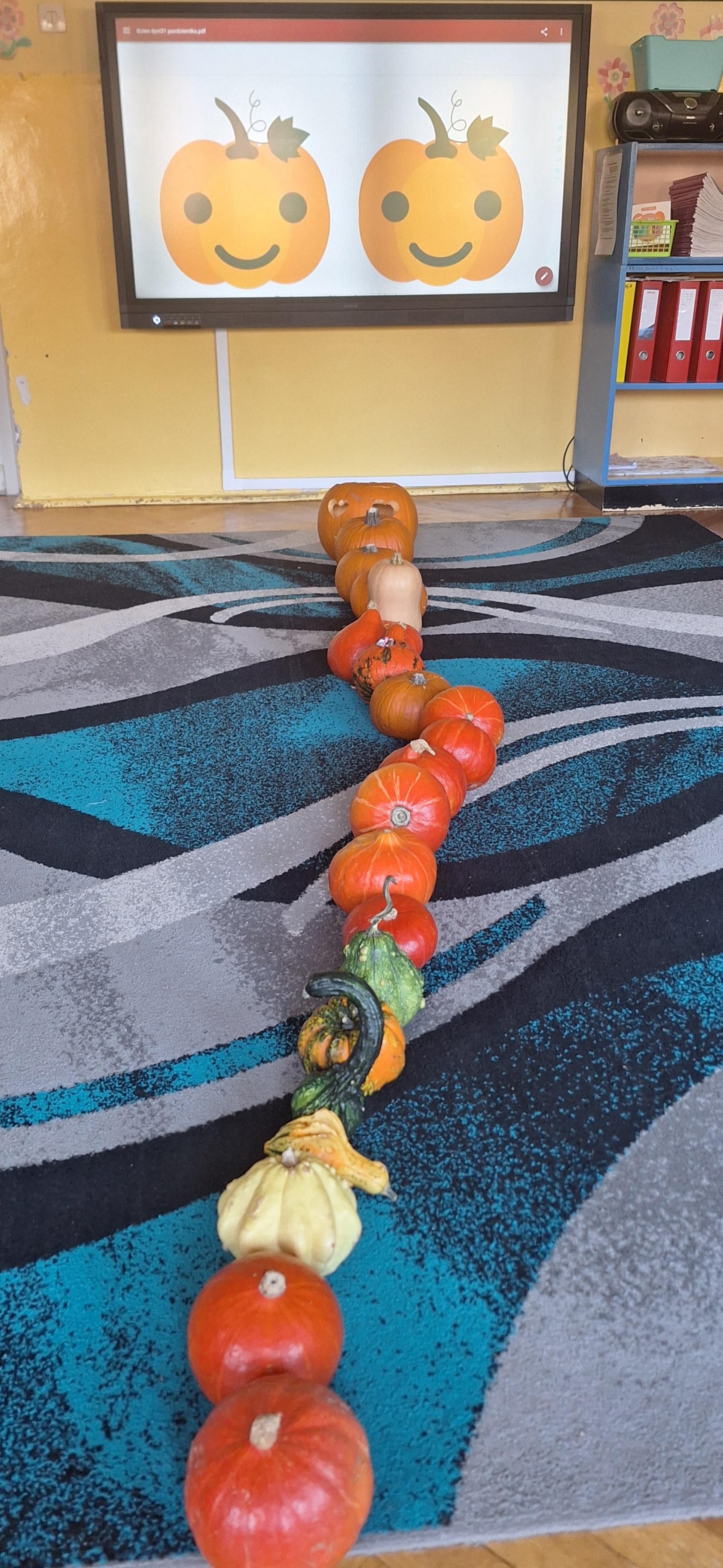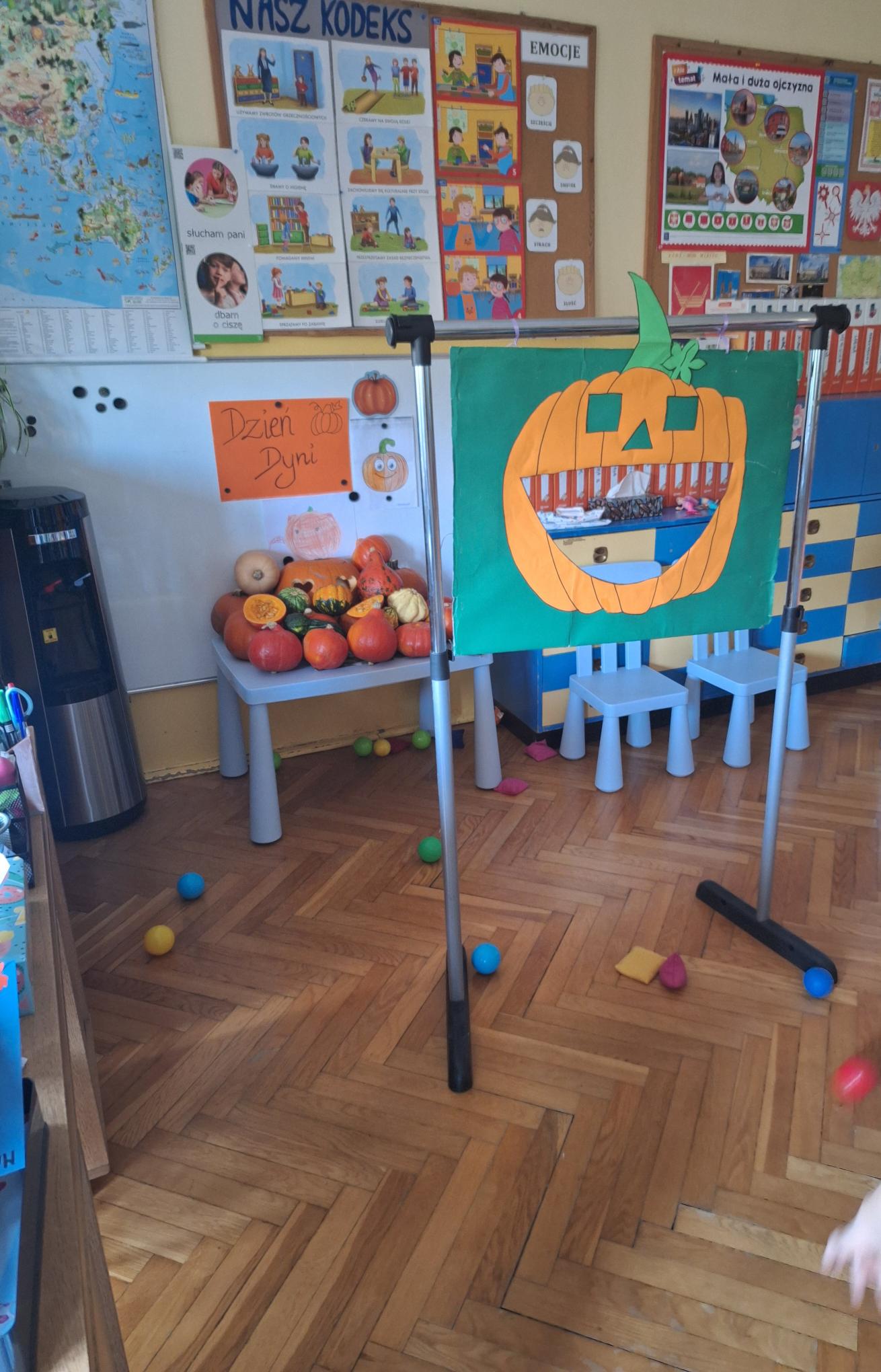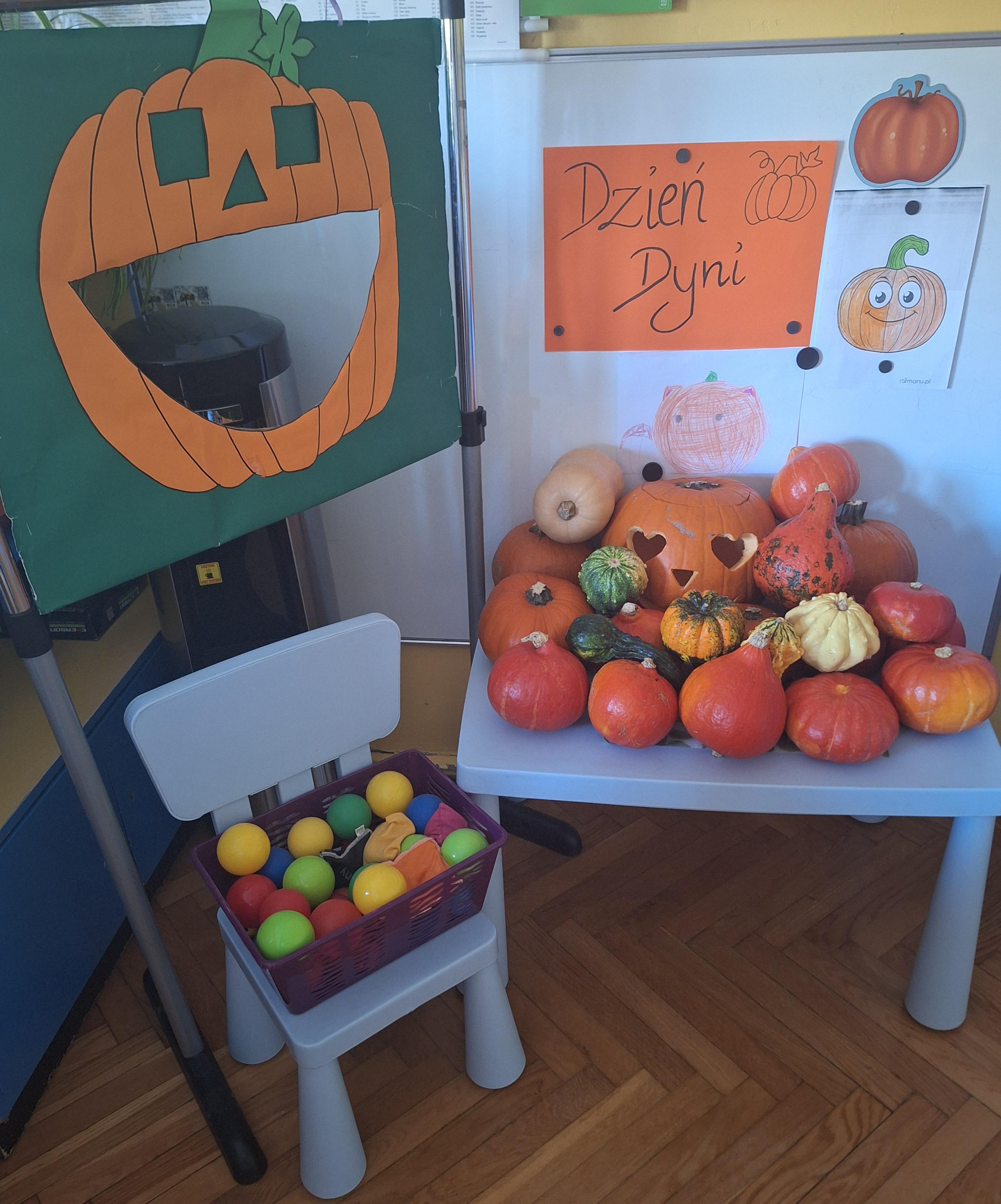 31 października w naszym przedszkolu odbył się Dzień Dyni. Dzieci na ten dzień przyniosły dynie aby nimi udekorować salę. Misie poznały wielką różnorodność dyń i wzbogaciły wiedzę na ich temat. Wzięły udział w licznych zabawach: segregowały dynie według wielkości, kształtu i koloru. Poznawały dynie od środka, sprawdzały przekrojoną dynie, dotykały miąższu i pestek. Dzieci karmiły głodną dynie kolorowymi piłeczkami.