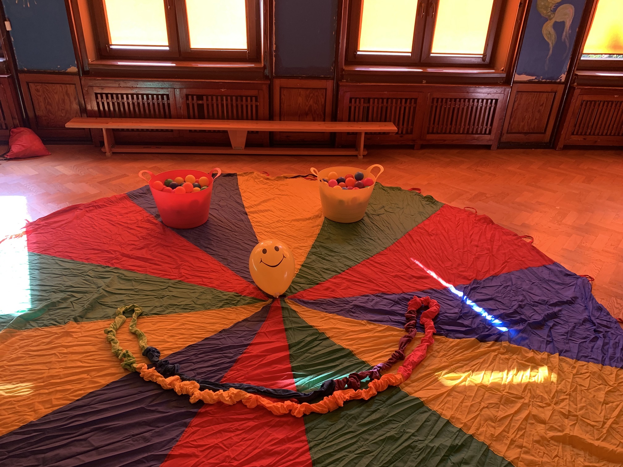 Na zdjęciu jest rozłożona chusta animacyjna na której ułożona jest uśmiechnięta buzia z sigumy, balona i dwóch pojemników z kolorowymi piłeczkami.