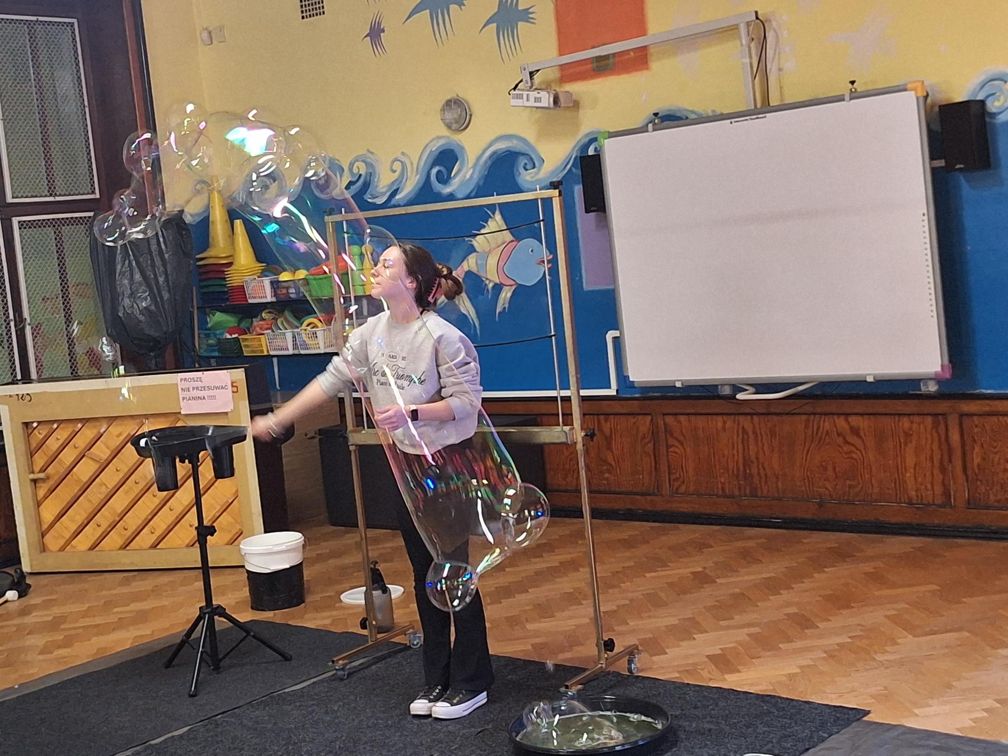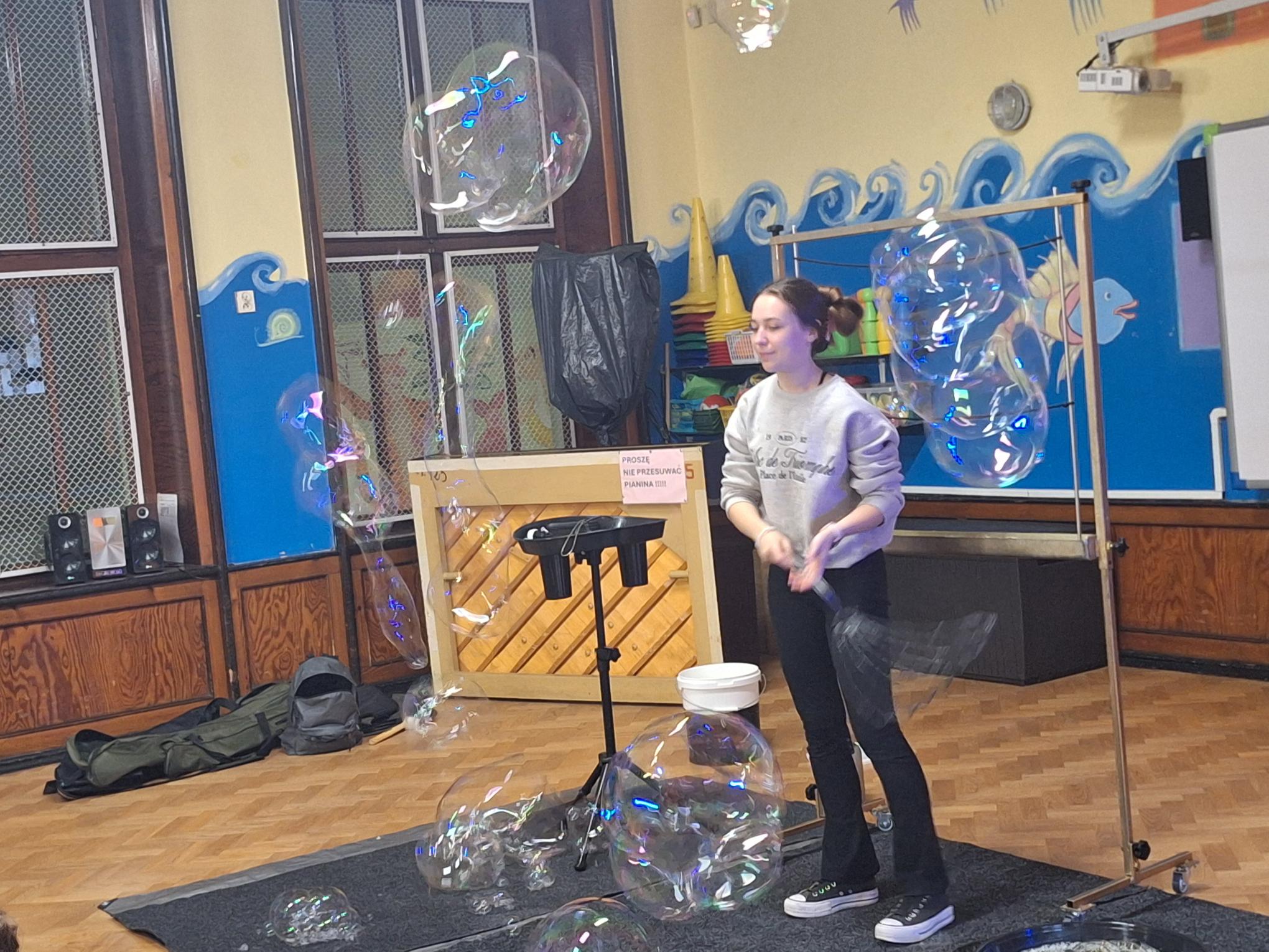Do naszego przedszkola zawitał niesamowity Teatr baniek mydlanych, który był ogromną atrakcją dla naszych przedszkolaków. Pani podczas pokazu wykorzystywała specjalny ,,bańkowy'' sprzęt który tworzył gigantyczne bańki i tunele. To był wspaniały i magiczny pokaz, gdzie głównymi bohaterkami były bańki, które wywoływały ogromną radość u dzieci.